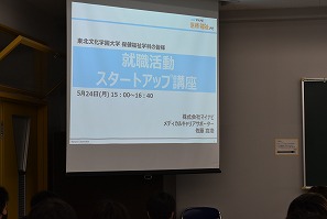今回は株式会社マイナビの佐藤嵩浩氏を招いて「就職活動スタートアップ講座」をおこなっていただきました。