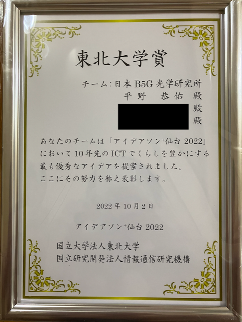 この大会は、B5G (Beyond 5G)の10年後のICTを利活用した地域課題解決をテーマとしたアイデアソンで、東北大学とNICT(※)の共催により2022年10月1、2日の二日間にわたってオンライン開催されたものです。