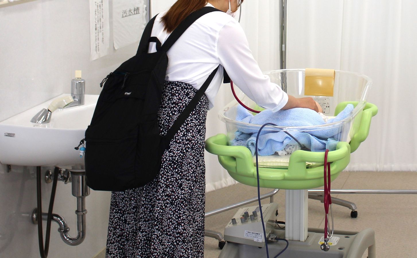 母性看護学では、新生児のバイタルサイン、おむつ交換、抱っこの仕方を行いました。