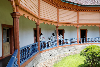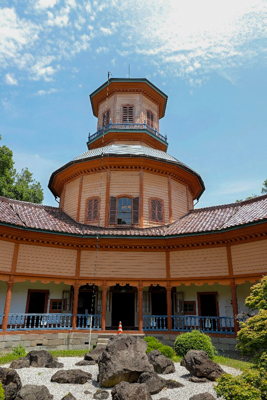 山形市郷土館は、擬洋風建築と言われる建物のため洋風と和風の要素がいたるところに見られ、不思議な感覚になりました。また、円形の構造や外見は三層で内部は四階という複雑な構造が印象的で面白い建物だなと感じました。私は特に螺旋階段がけやきに唐草の彫刻が施され和を感じられると同時に、螺旋階段という構造から洋風を感じられ、擬洋風建築が現れている部分だと思いました。二階の窓から外を見ると擬洋風建築と和風の中庭が見渡せて心が安らぐような景色が見られ、当時の様子が思い浮かべられるような気がしたので、ぜひ三階と四階にも行って景色を見たかったなと思いました。夏に行きましたが各部屋の窓やドアから心地よい風が入り、換気の部分で建物の構造の工夫が感じ取れました。展示品は医療系のものが多く、医療資料や医療機器などを昔と今で照らし合わせて医学の歴史を学ぶ貴重な機会になりました。